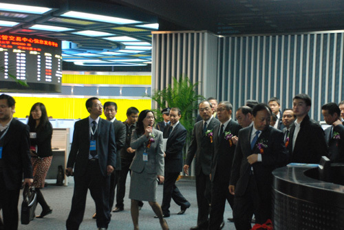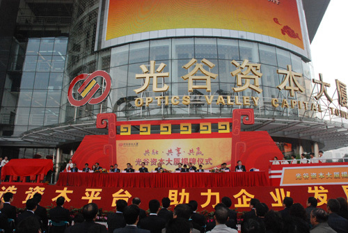 上午10:10分,武汉市长唐良智宣布揭牌仪式开始,并介绍光谷资本大厦建设背景、一期建设情况和发展规划。市委常委、东湖高新区管委会党工委书记贾耀斌致欢迎辞。省领导李鸿忠、王国生、张昌尔、阮成发、李春明为光谷资本大厦揭牌。李鸿忠书记、王国生省长并为武汉股权托管交易中心、武汉金融资产交易所、武汉农畜产品交易所揭牌并为三家单位敲击编钟,启动了各交易中心的开盘仪式。随后,出席揭牌仪式的各位领导,来宾参观了三楼光谷资本大厦公共交易大厅和部分入驻的单位。集团公司董事长赵家新、总经理范蕴玉等领导陪同考察。