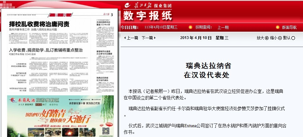 仪式后,武汉江城锅炉与瑞典Extuna公司签订了在热水锅炉和蒸汽锅炉方面的意向合作书。