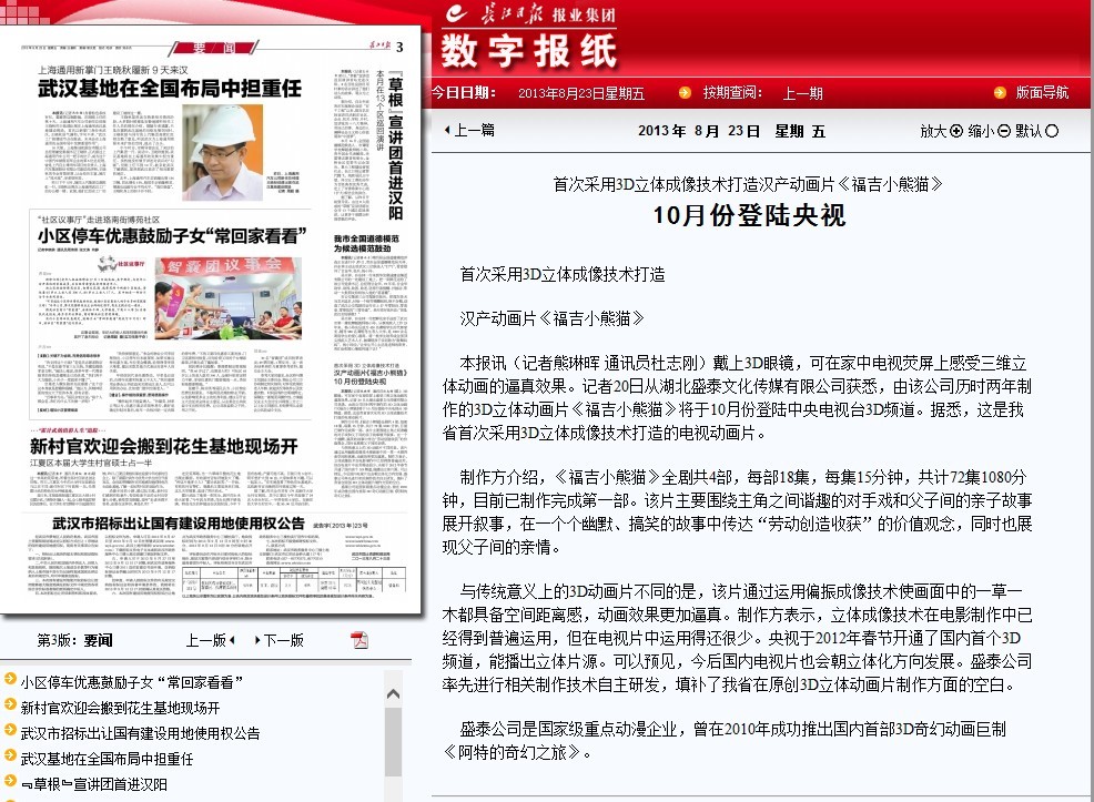 本报讯(记者熊琳晖 通讯员杜志刚)戴上3D眼镜,可在家中电视荧屏上感受三维立体动画的逼真效果。记者20日从湖北盛泰文化传媒有限公司获悉,由该公司历时两年制作的3D立体动画片《福吉小熊猫》将于10月份登陆中央电视台3D频道。据悉,这是我省首次采用3D立体成像技术打造的电视动画片。