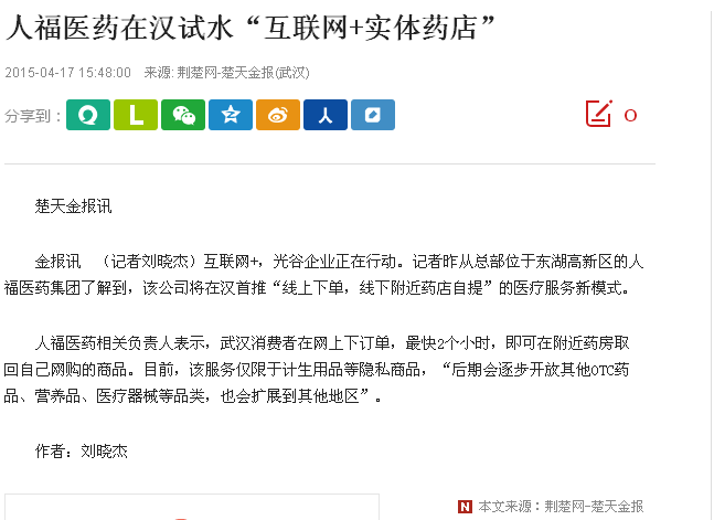 金报讯 (记者刘晓杰)互联网+,光谷企业正在行动。记者昨从总部位于东湖高新区的人福医药集团了解到,该公司将在汉首推“线上下单,线下附近药店自提”的医疗服务新模式。