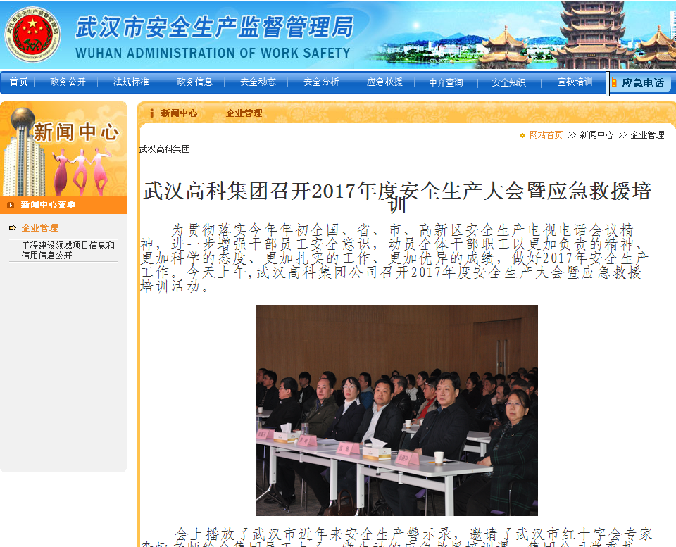今天,武汉市安监局政府网站报道了集团公司上周召开的《武汉高科集团公司召开2017年度安全生产大会及应急救援培训活动》新闻,市安监局对于高科集团通过本次活动增强全员安全意识,有针对性的提高应急救援的实用效果进行了充分肯定,在市属企业中发挥了示范标杆作用。