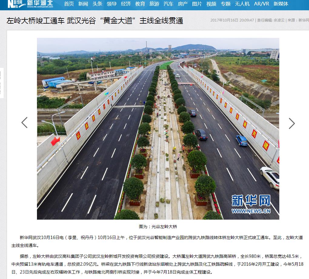 据悉,左岭大桥由武汉高科集团子公司武汉左岭新城开发投资有限公司投资建设。大桥属左岭大道跨武九铁路高架桥,全长980米,桥面总宽达48.5米,中央预留13米有轨电车通道,总投资2.09亿元。桥梁在武九铁路下行线新店站东咽喉处上跨武九铁路及化工铁路疏解线,于2016年2月开工建设,今年5月18日、23日先后完成左右双幅转体工作,与铁路南北两侧引桥实现对接,并于今年7月18日完成主体工程建设。